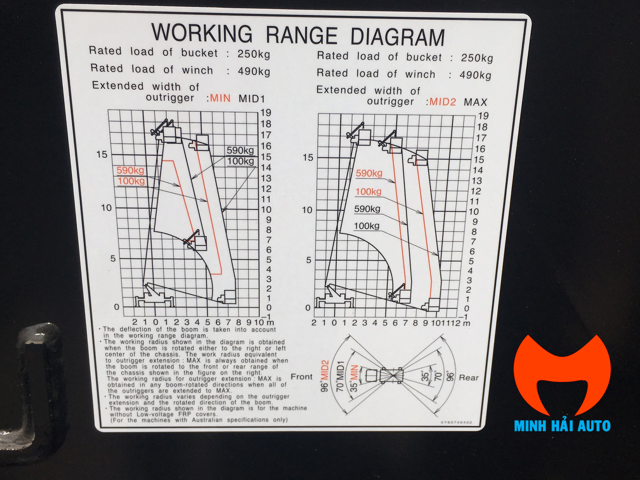 - Hạn chế bán kính làm việc: Bán kính làm việc tự động điều chỉnh hoạt động an toàn tương ứng với chiều dài cần, độ duỗi chân chống.