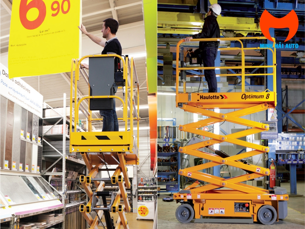 Xe thang nâng người 8m Haulotte Optimum 8 phù hợp với rất nhiều công việc thi công trên cao như: sửa chữa, bảo dưỡng, lắp đặt đèn điện, bảng hiệu; thi công hệ thống phòng cháy chữa cháy nhà kho, nhà xưởng, nhà máy…